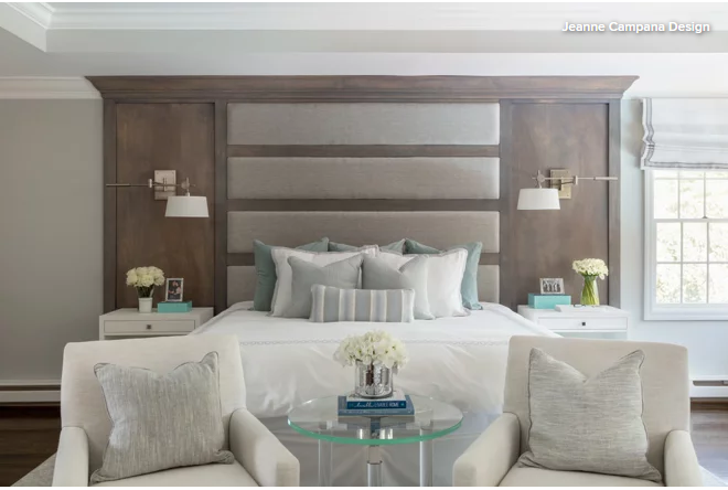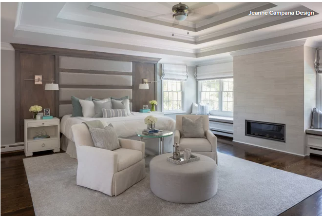 Window seats, a gas-burning fireplace and a soothing color palette were among the requests designer Jeanne Campana received from her clients when renovating their master bedroom in East Islip, New York.