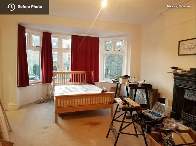 Before: The previously cream-toned bedroom included red curtains and a small bed stationed in front of the bay window, perpendicular to the fireplace.