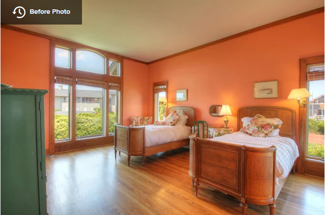 Before: The former bedroom included natural wood trim around the windows, a pair of twin beds and peach-colored walls.