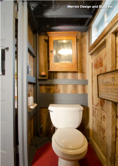 Just do the basics. This bathroom, which abuts one of the laundry rooms I’ve featured, is mostly unfinished. Creatively sectioned off with wood planks and paint, it proves that a bathroom need not have marble and high-end finishing to be warm, cute and functional.
