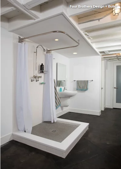 Leave it open. Another way to save some money in your basement bathroom is to skip the walls altogether. Here, a section of the basement is used for the bathroom, which is open concept. The shower is made out of a tiled curb with a curtain bar, giving it a modern look when privacy is not a concern. The toilet, not seen in this photo, is in a separate, walled-off enclosure behind the wall with the towel bar.
